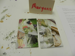 After doing some paper staining and time was running short, I gave everyone a fun little exercise to end the day and get everyone warmed up for collage. I asked them to go through a couple of magazines and look for colors, words, and imagery that catches their eye; things that relate to one another. Then they were to make two little 3x5 collages on card stock.