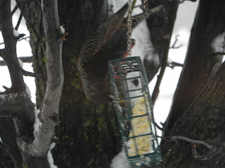 Yesterday morning there was a male and a female Cardinal at the suet block, but Henri beat me to the window and they flew away. Henri can be sleeping, but if I am heading for the window with my camera, he wakes up and follows me as if he knows. I took some pictures anyway and even though this is just the little sparrow, I love his beautiful brown colors on his back.